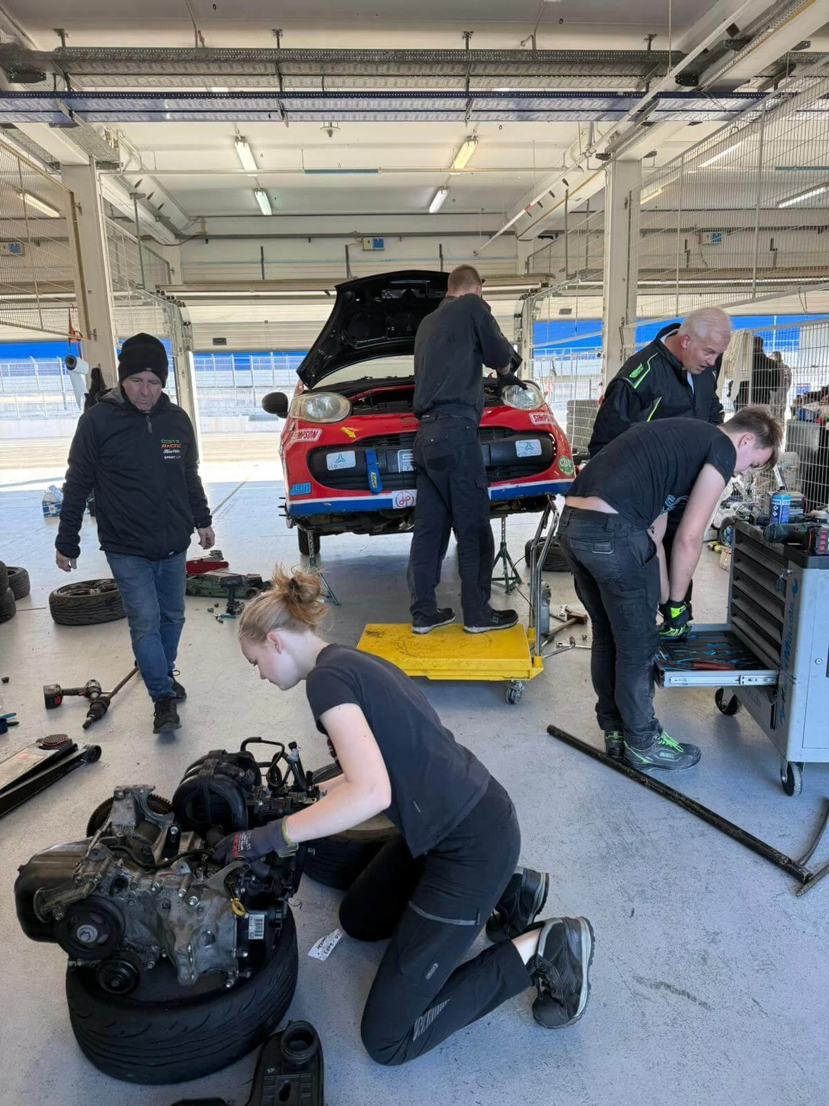 Na ongeveer 27 uur rijden komen we dinsdag aan het einde van de dag aan voor de laatste tussenstop. Woensdagmiddag rijden we voor de laatste 100 kilometer naar het circuit van Estoril. Als we uiteindelijk toegang hebben tot de pitboxen worden alle spullen uitgeladen en de pitbox ingericht.