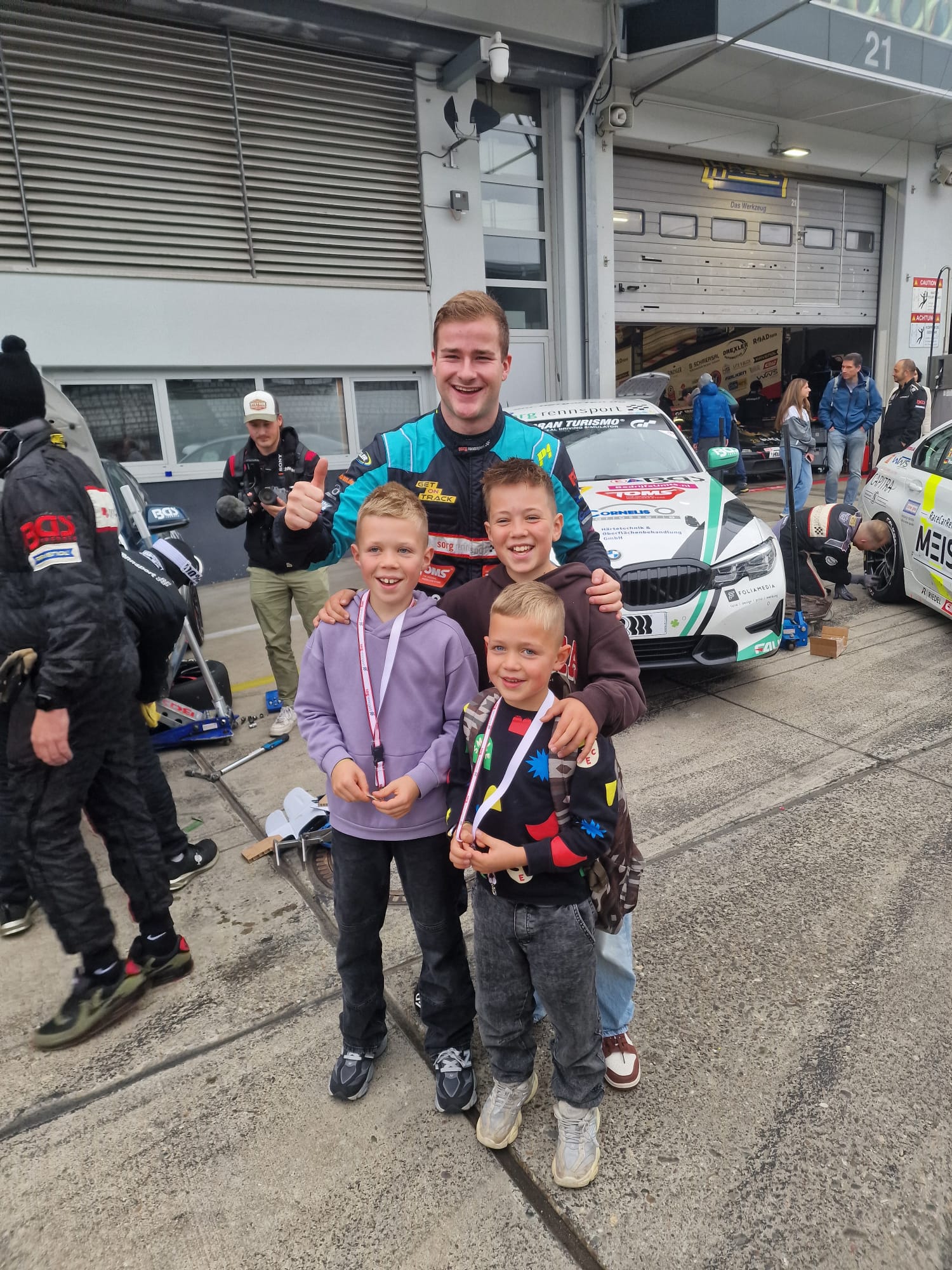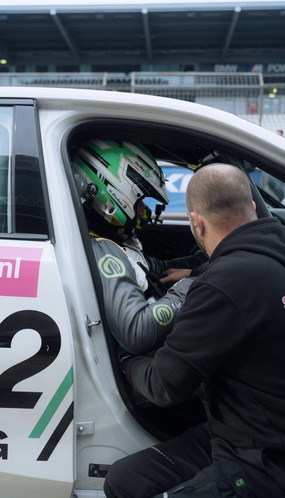 Als het einde van de middag nadert ga ik me klaarmaken om de training te rijden. Ik kijk nog even naar mijn onboards en data zodat ik weer vers in mijn systeem heb zitten wat ik moet doen. Waar ik gewoonlijk direct in de BMW stap, ben ik nu eerst als rijder van Sorg ingezet om een incentive van Vodafone Duitsland te verzorgen. Ik mag dus voor mijn eigen trainingstijd rijden in een Porsche Cayman GT4 RS met gasten van Vodafone! Erg waardevolle rijtijd met het oog op de toekomst.